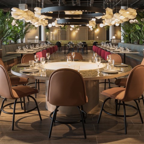 The other areas, such as the menu service and buffet area (salads, desserts, ice cream and toppings) recreate a large fantasy machine offering joy for the senses, with food and entertainment in the leading role.