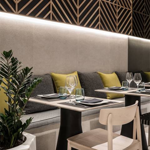 El espacio se abre a una gran terraza mediante un sistema especial que se ha creado de amplias ventanas abatibles, que permiten que el espacio se transforme del día a la noche. Una sorprendente puesta en escena que te traslada a los famosos restaurantes de Nueva York, donde interior y exterior se fusionan.