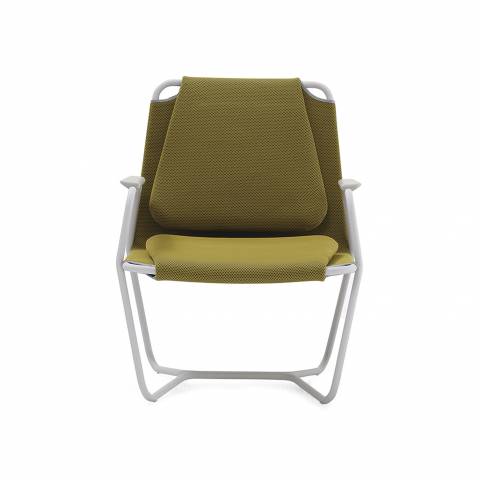 Para realzar las formas, el asiento se envuelve con un voluminoso vivo revestido del mismo tejido, junto a un particular aro metálico que abraza las patas aportando así carácter único a la colección.