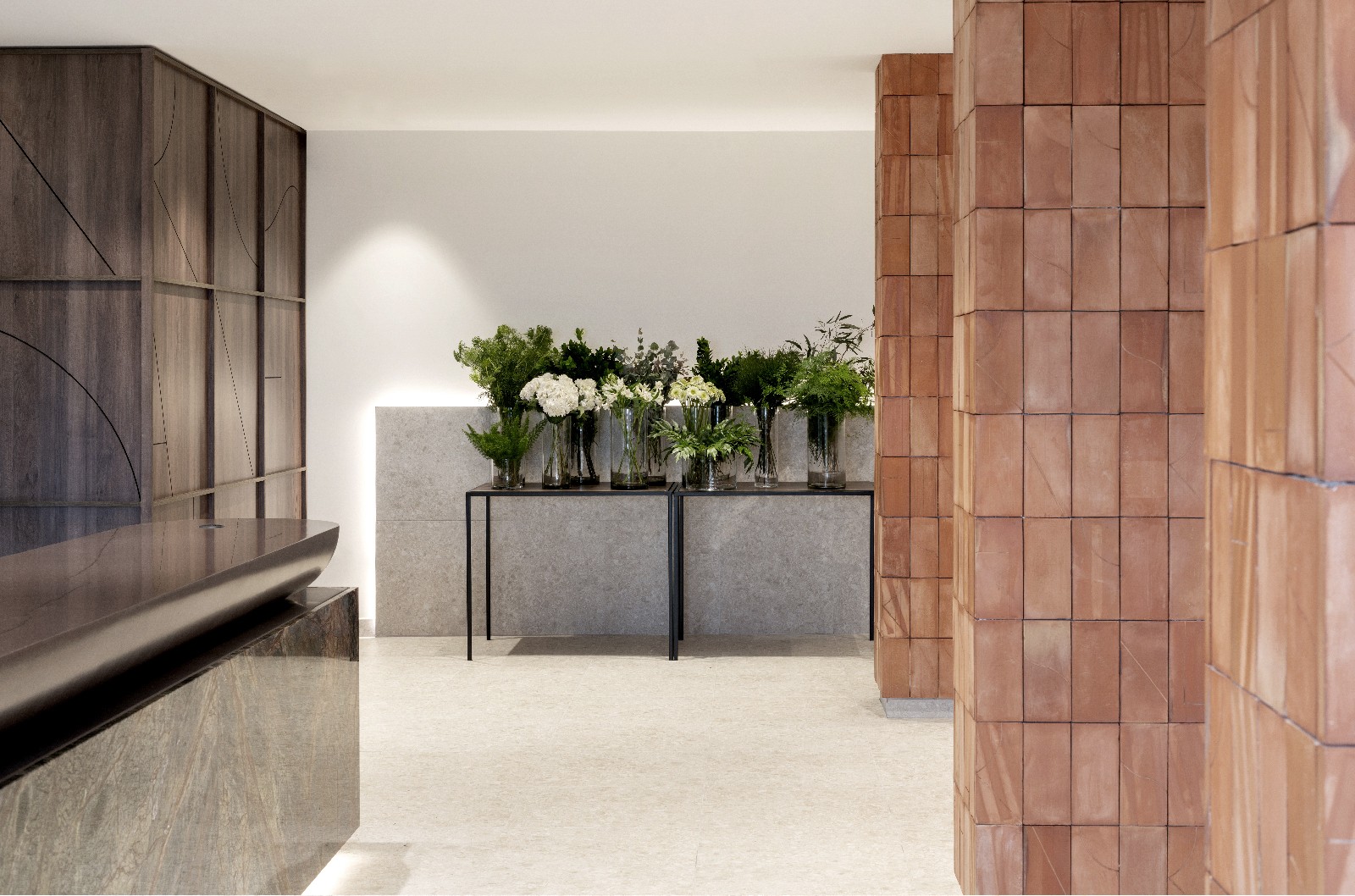 El espacio esta dividido en dos importantes áreas, una primera donde se ha generado un concepto de espacio estilo galería donde se presenta a los clientes los arreglos florales y una selección de elementos decorativos, y una segunda en la que se ha concebido el taller floral.
